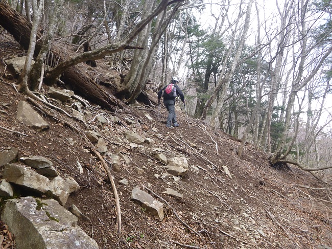 ![]() 2 続編・7で下降した小尾根を見送り、トラバースで右岸を進む。 |