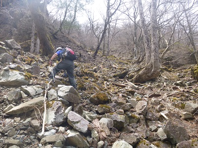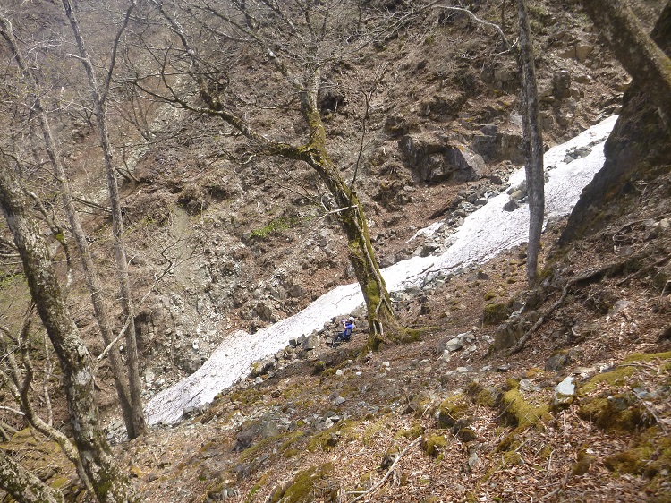 | あとがき 早戸川林道がオープンになり、誠にうれしい。 この時期の道路はどこもかしこも車で溢れるのだ。 安近短でもあり、早戸川流域は我らにとって救いの神である。 今回もEAさんの了解をいただき、意気揚々と本谷沢を目指すのだ。 早戸川右岸の植林地に大きく間伐等の手が入り、径路の整備がされていた。 我らもその整備にあやかり、往路、復路共に利用させていただいた。感謝である。 雷平から大滝沢と本谷沢の出合いまでの呼称はどうなるのか知らない。 とにかくこの間の沢の様子が大荒れ台風後とまるで違っているのに驚いた。 倒木地獄も無ければ、河岸段丘の様子もまるで違うのだ。 とても歩き易くなり、早戸大滝や本谷沢も来やすくなったと思う。 本谷沢の今回の遡行はチョベリグ(古!)であった。 また時期がよし、近年にない遅い時期の降雪もよし。 大雪渓?は滅多にない、最高のオマケ、大サービスであったのだ。 オレの足取りは超カメである。EAさんはよく耐え抜いて付き合って下さる。 GPSでのRFやチョット危ない時のスリング等お世話になっている。 共通の病とはいえ、感動を共有でき、誠に感謝に耐えない。 |