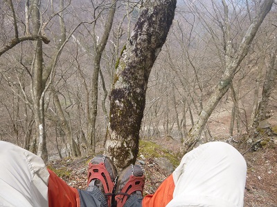 ![]() 18 極上のロケーションの中でランチタイム。 ここの情景は擂り鉢底の様である。地形図みると不動ノ峰水場と地図にあったが、正に その水場より少し下に位置しているのだ。 |