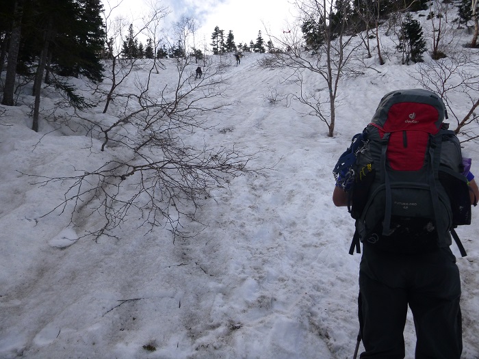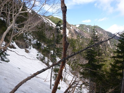 | 15 いよいよ登りの本番になって来た。向こうに常念岳と右手が前常念。 13写真の後、登りに転じたら雪が出て来た。標高2000m位である。 ハイキングの様な良い登山道は13写真までであった。 15写真の左手が蝶ヶ岳への急斜面が続いている。 ここより急斜面に張り付く残雪を樹林の中の登りや、小沢上部のトラバースをして行く。 |