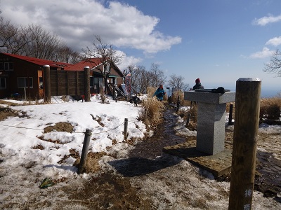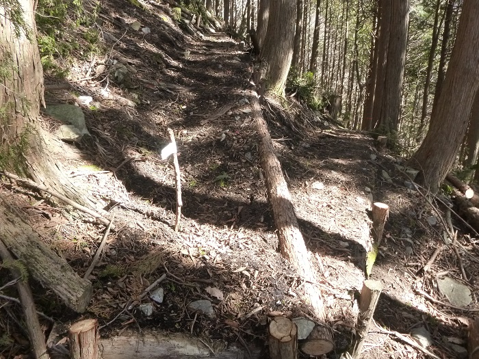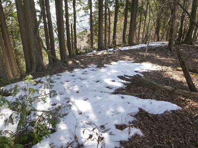 | 17 中間地の真っ平に上がった。この辺りから日陰に残雪あり。 仕事道が延長されたな〜。(上部の植林地内も皆作成するようで下ごしらえもあった) |