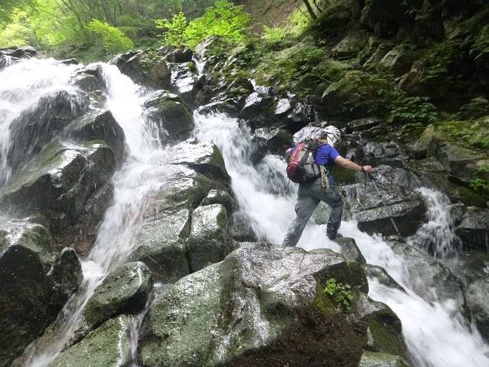 | S2 ほとばしる水流の中、岩角を踏み登って行く‥。 |