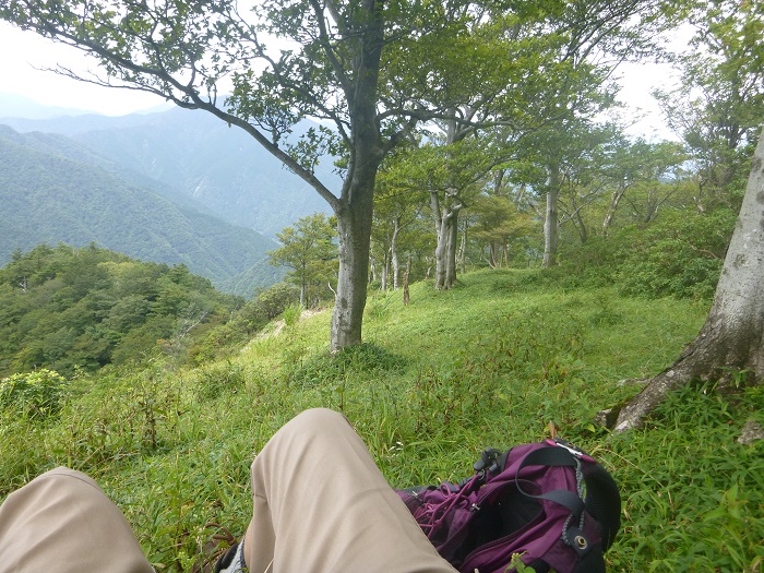 12 姫次の休憩所。 辺りの立木が生長して展望が悪くなった。 展望を楽しむにはやはり冬場でなくちゃ〜ね。 林道のゲート手前P出発が8時で姫次着が10:25、ほぼコースタイムに近い。 オレには満足のタイムである。 景色を楽しんだり、花の写真 を撮ったり、休憩も含んでいて疲れは感じていない。 問題はこれからで、原小屋平までは下るだけだがその先の地蔵ノ頭を巻き終わるまでが かなり長い上り下りで疲れるのだ。そして急登の取り付きまで行ってしまえばもうバックは出来ない。 |