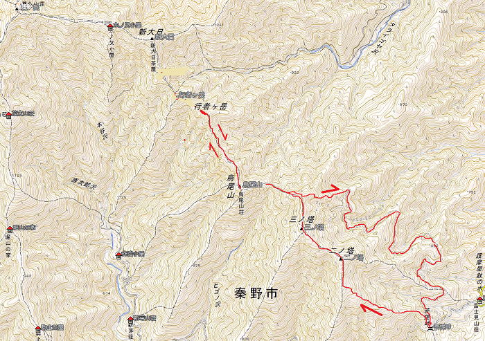 手書きのルート図 行者ヶ岳の鎖場まで行き戻ったね、(なんでやねん) 三ノ塔北面と水沢林道の歩きがあるから早く行きたいんだって~。 |