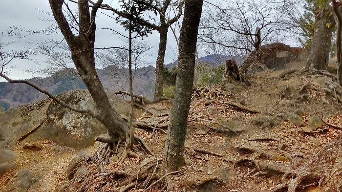 5 急傾斜のジグザグ登りをやっつけると見晴しのよい岩場に着く。 |