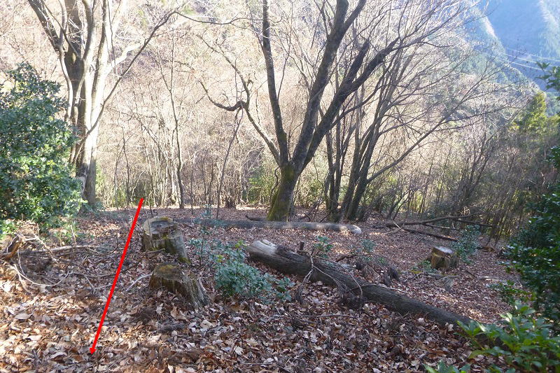 | 28 下りた沢から左岸側を見ると径路が読める。 |